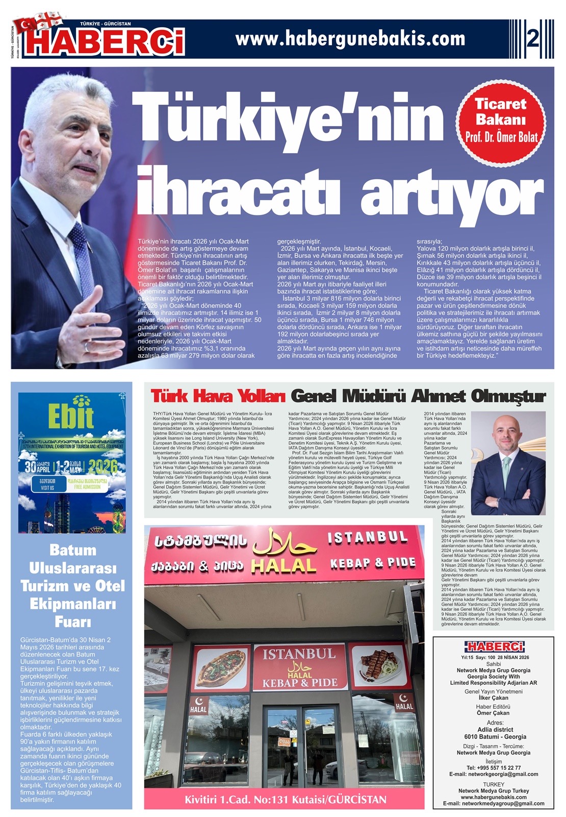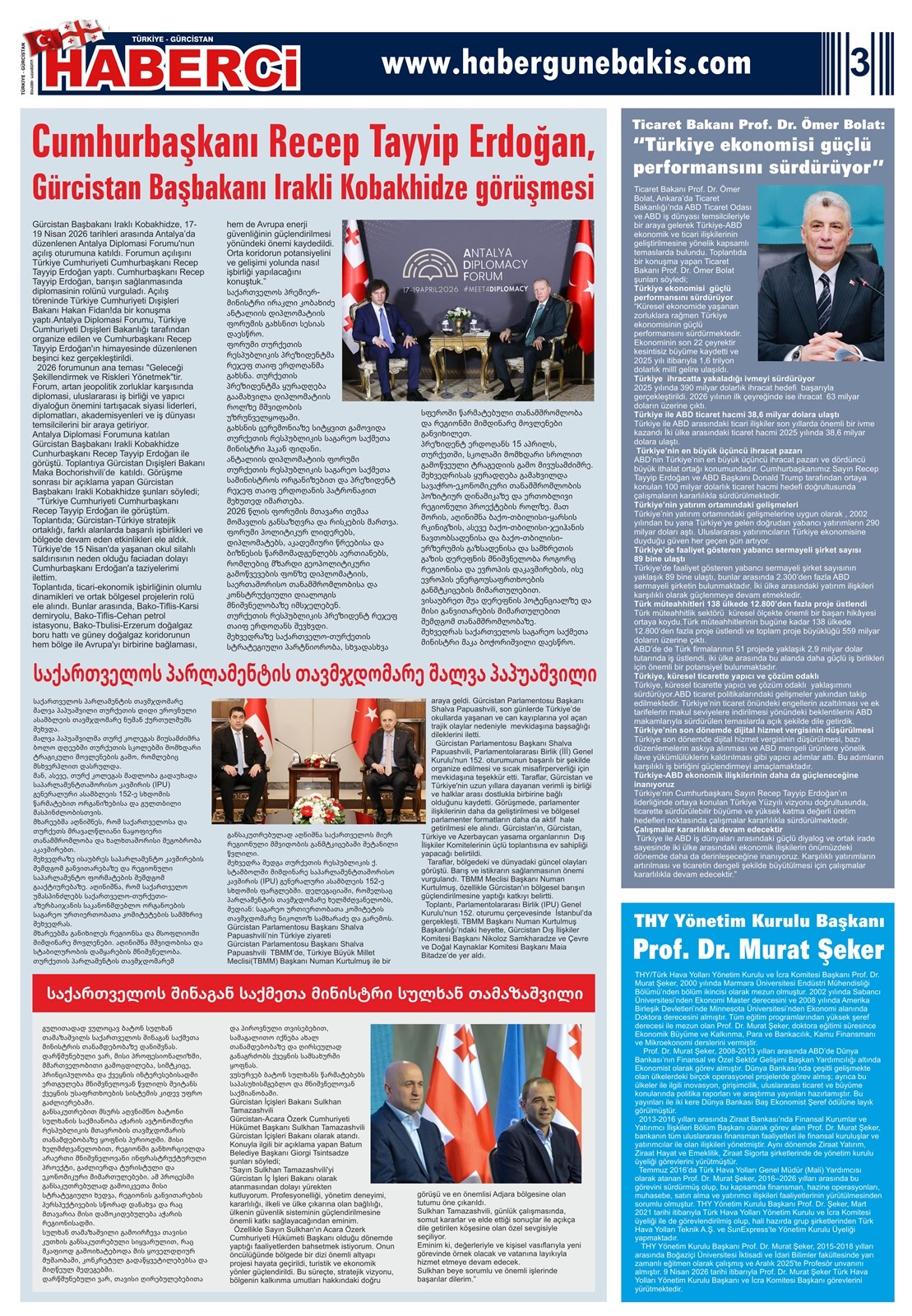Gürcistan-Acara Özerk Cumhuriyetinin başkenti Batum’da 5 Temmuz 2011 tarihinden itibaren 1.sayısı ile yayın hayatına başlayan, yayın hayatında 15. yılında olan , Türkçe-Gürcüce olarak iki ayrı dilde 15 günde bir yayınlanan , Gürcistan ve Türkiye’de( Karadeniz Bölgesi) ücretli abone usulü dağıtımı yapılan, Avrasya Bölgesinde örneği olmayan uluslararası “Türkiye-Gürcistan Haberci Gazetesi”nin 28 Nisan 2026 tarihli 100. sayısı çıktı Kuşe kağıda baskılı, 15 günlük tirajı 2.000 olup, 4 sayfa renkli olarak yayınlanmaktadır.